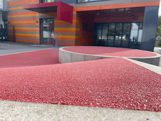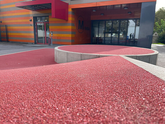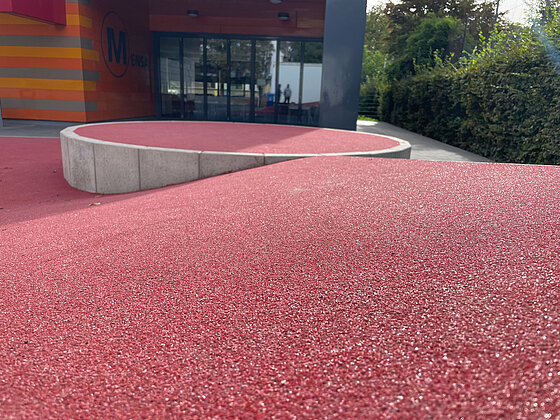 Dieses zirkuläre Material wurde bewusst für den Schulhof gewählt, um eine einladende und kreative Atmosphäre zu schaffen. Dabei wurde besonders darauf geachtet, dass die Farbe des Belags zur nahegelegenen Mensa harmoniert. Diese bewusste Farbabstimmung schafft eine ästhetische Einheitlichkeit im Schulgelände und verleiht dem Ort eine einladende Ausstrahlung. Zudem ist GRANUVIT LR aus 100% recyceltem Glas hergestellt und sorgt für eine sehr gute bauliche Klima-Bilanz.