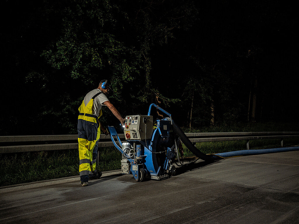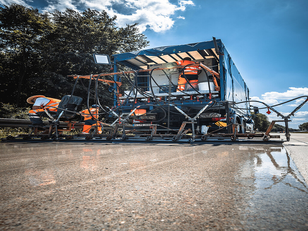 First of all, demarking was carried out and then the carriageway was grinded with the bump cutter. This construction work was carried out by our North Division, which has the necessary know-how and specialists in the field of grooving and grinding. After shot peening, a new road surface course was applied using EP-GRIP MOBIL. On an area of around 4,500m2, damaged areas were rehabilitated here, the pavement completely refurbished and the underlying concrete pavement protected for years to come. Our specialist personnel from the special pavements department were called into action here. After the roadway had been re-marked, it could be reopened to traffic after 48 hours.
