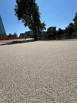 Ein weiterer Vorteil der Beschichtung zeigt sich direkt vor Ort: Dank der hellen Oberfläche heizen sich die Plätze und Wege weniger auf. Zusammen mit der begrünten Fassade des Kö-Bogens II – Europas größter Grünfassade mit mehr als 30 000 Hainbuchenhecken – verbessert die Beschichtung so das Mikroklima der Stadt. Erfolgreiche Zusammenarbeit Die Stadt Düsseldorf vertraut damit erneut auf EP-GRIP URBAN als Lösung, die sich in Funktion und Gestaltung bewährt hat. Die erneute Beauftragung zeigt, wie gut Planung, Ausführung und Ergebnis zusammenpassen und dass Qualität auf Dauer überzeugt.
