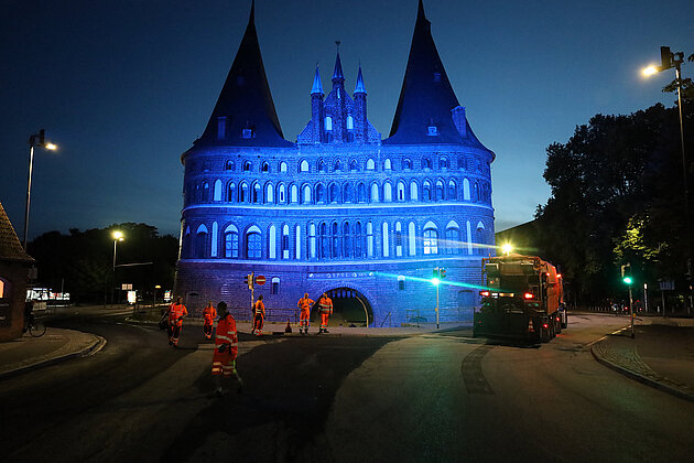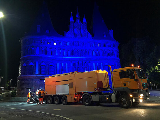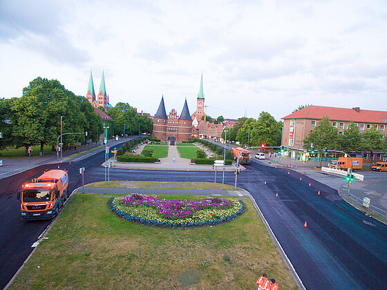 In Lübeck, der Heimatstadt unseres Mutterkonzerns L. Possehl & Co. mbH, hat diese Bauleistung bereits bei früheren Projekten überzeugende Ergebnisse gezeigt. Von Mai bis August 2022 sanierte POSSEHL Spezialbau nun in der Hansestadt innerstädtische Straßen und Verkehrswege mit einer Gesamtfläche von rund 210.000 m2. Ein absolutes Highlight des  Großprojekts war die Sanierung der Straßen rund um das Wahrzeichen der Stadt Lübeck ‒ das Holstentor.
