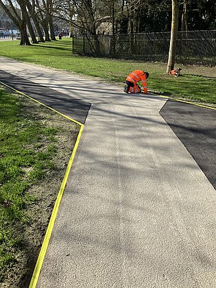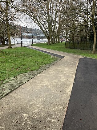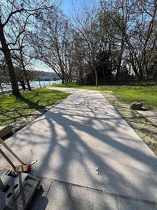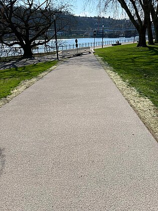 Der Original-POSSEHL-Belag überzeugt insbesondere durch seine Langlebigkeit: Er hält bis zu fünfmal länger als herkömmliche Lösungen und eignet sich daher besonders gut für stark frequentierte Wege – perfekt für die Parkanlage mit ihren zahlreichen Spaziergängern. Die Kombination aus Epoxidharz und Gestein schafft zudem eine griffige Oberfläche, die auch bei Regen, Schnee und Glätte Sicherheit bietet.