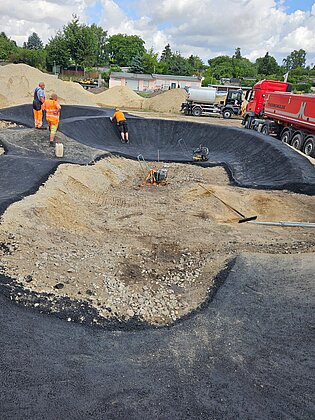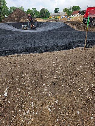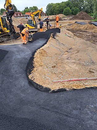 Wir von POSSEHL Spezialbau lieben aus unserer Tradition schon Innovation und Transformation und sind Stolz darauf auch zu diesem Projekt unseren Beitrag geleistet zu haben. In Handarbeit (!) hat unsere Asphalt-Kolonne ca. 200 t Asphalttragdeckschicht für die Bikestrecke aufgebracht. Das entspricht ca. 1.000 m2 über die 10 cm Tragdeckschicht asphaltiert wurden. Mit mehreren Kleingeräten wie Rüttelplatten und weiteren Spezialgeräten wurde der Asphalt dann noch verdichtet. Aufgrund der sehr speziellen und engen Kursführung gab es hier keine Möglichkeit zum Einsatz von großen Maschinen.